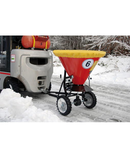 Der Streuwagen Typ STW ist geeignet um Sand und Salz zu verstreuen und wird einfach an den Gabelstapler oder an kleine Schlepper angehängt. Der Streuvorgang erfolgt über die Drehbewegung der Räder und muss somit nicht extern mit dem Strom- oder Hydraulikanschluss des Zugfahrzeugs verbunden werden.